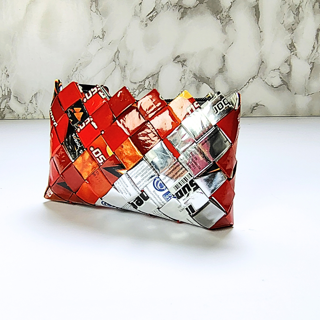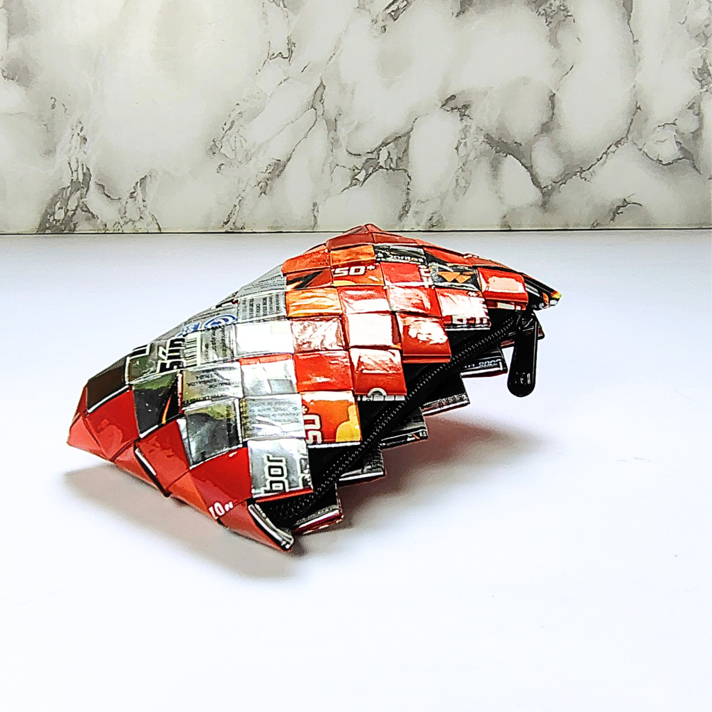 Nuestros monederos están hechos a mano con empaques de snacks reciclados, transformando residuos en piezas únicas, modernas y funcionales. Cada uno es diferente y celebra el arte de reutilizar con proposito.