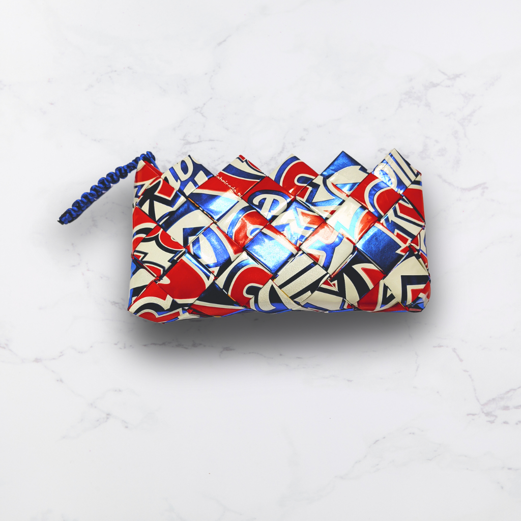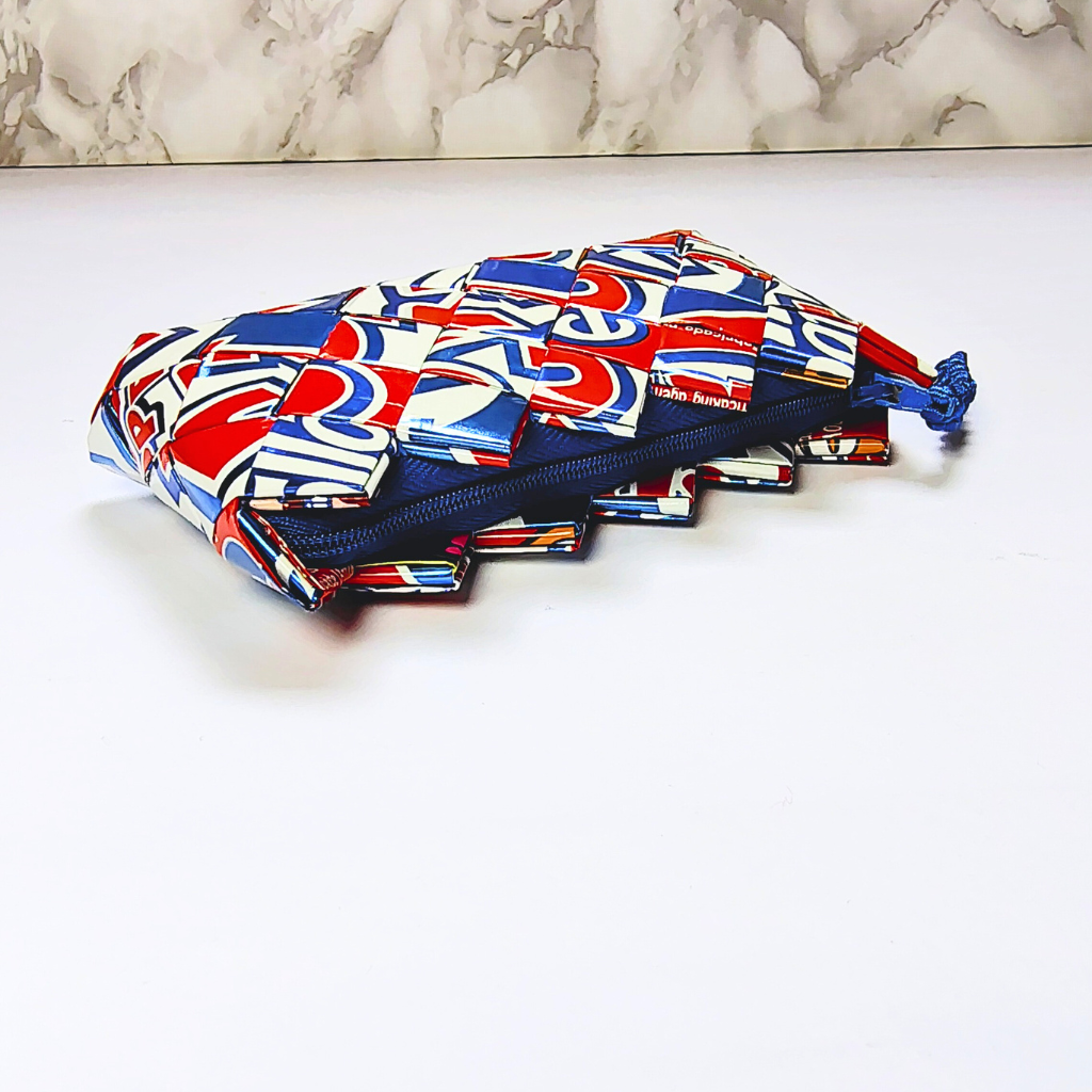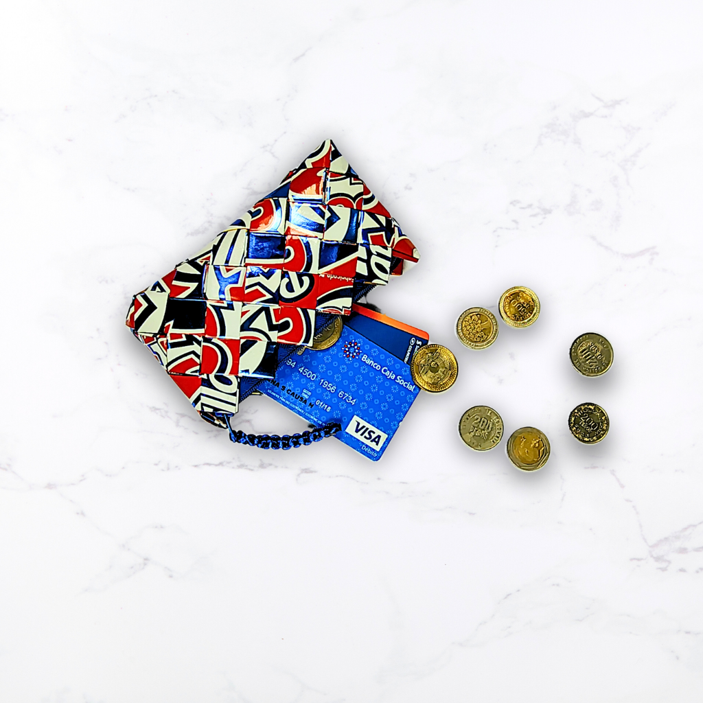 Nuestros monederos están hechos a mano con empaques de snacks reciclados, transformando residuos en piezas únicas, modernas y funcionales. Cada uno es diferente y celebra el arte de reutilizar con propósito.