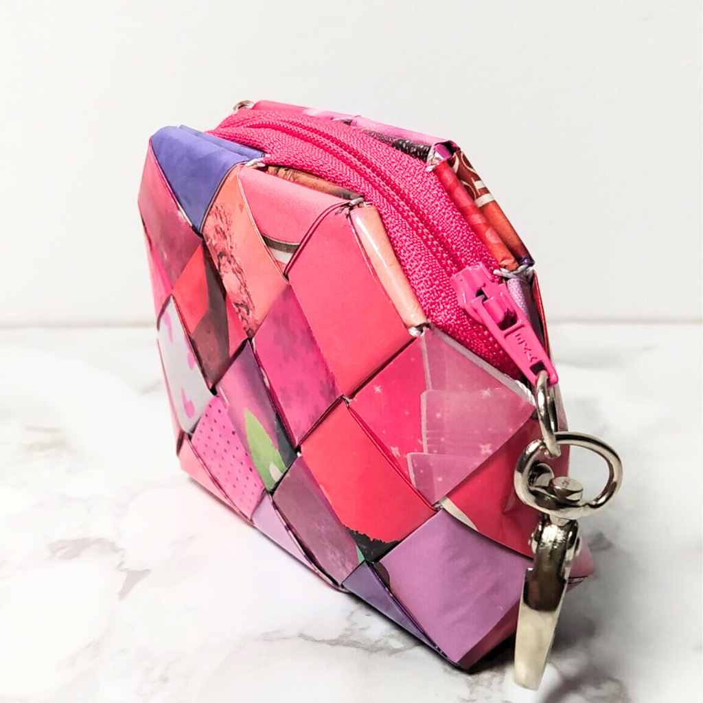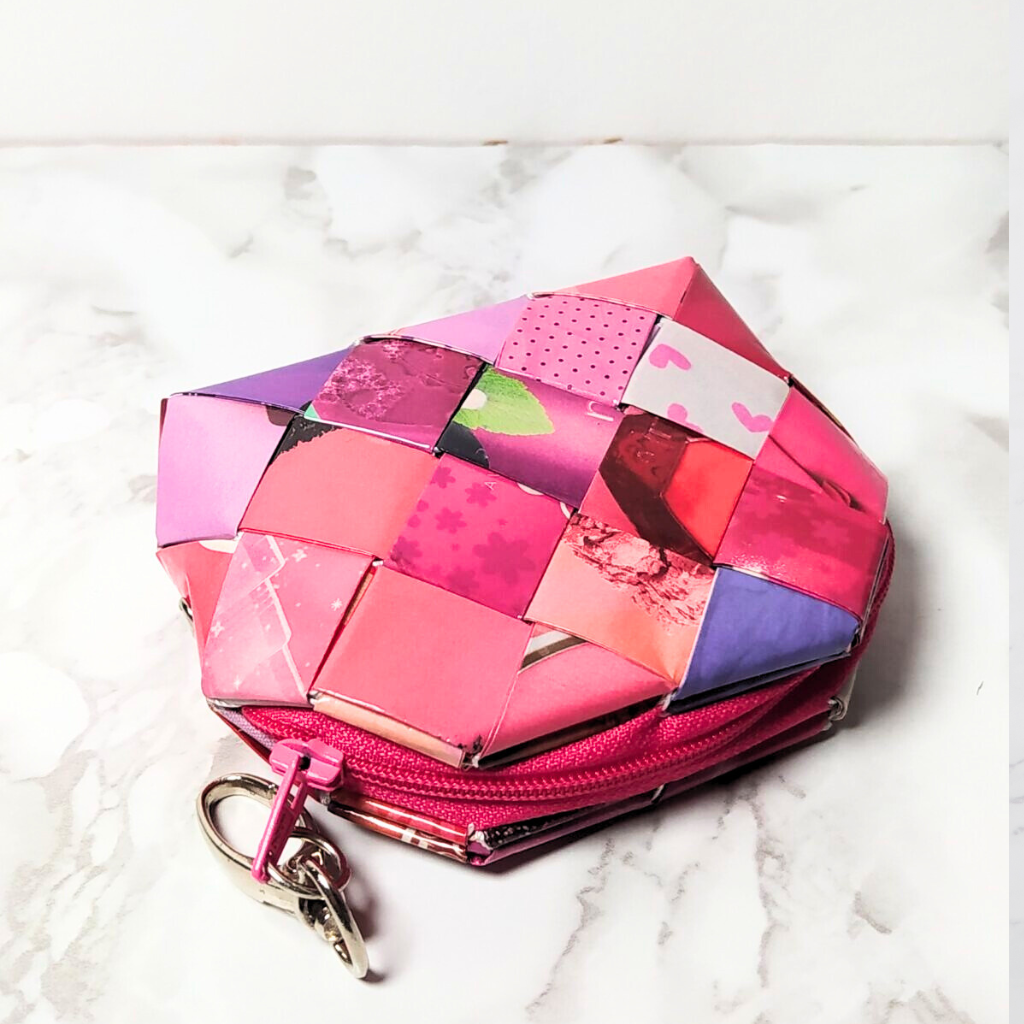 Añade un toque divertido y eco-friendly a tu colección de accesorios con nuestros monederos hechos a mano a partir de papel de revistas reciclados. Cada pieza es única y celebra el arte de la reutilización, transformando materiales desechados en productos de moda modernos y funcionales.